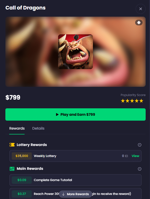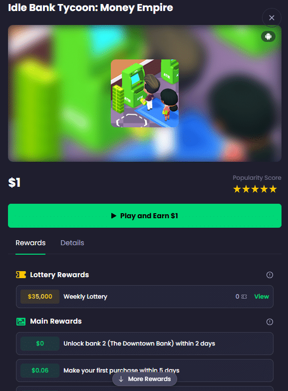 There's also lottery rewards on this game, plus it has a 5-star popularity rating. And if you can reach Kingdom level 100 within 14 days, you get $30.60, plus there's tons of earnings before then.
