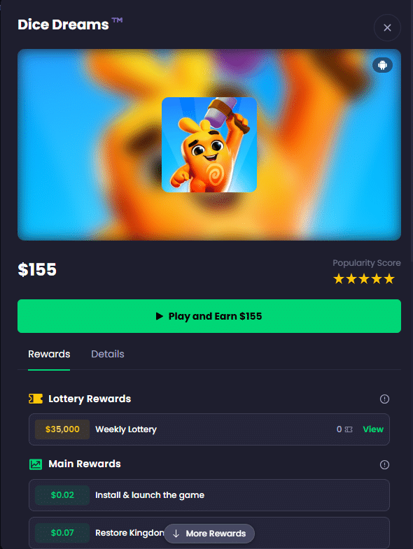 Dice Dreams has been a top Freecash game for a while. It pays up to $155 and has some very easy to complete milestones within your first few days. In fact, you can make a quick couple bucks just for downloading the game and completing the tutorial and first few levels.