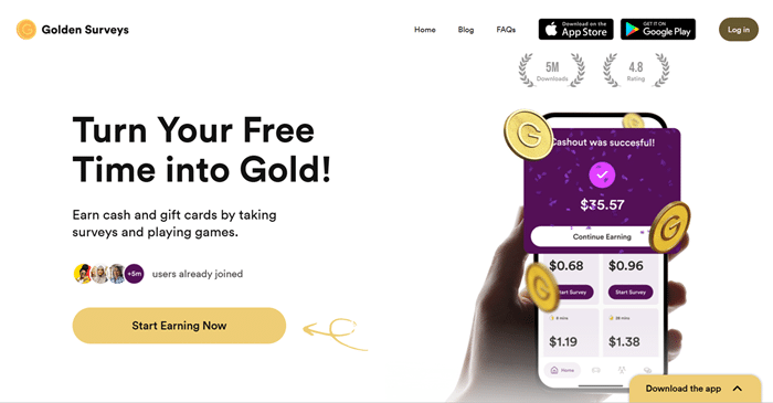 Surveys are the main way to make money. But in some countries, Golden Surveys also offers cash games and other download offers.