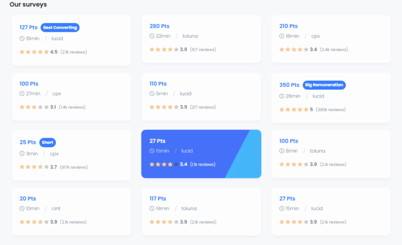 In my testing, I've found that most surveys pay between 25 points ($0.25) to 200 points ($2), but you can find higher-paying surveys.