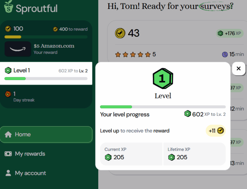 For example, you earn a 50 point streak bonus whenever you answer surveys for 7 days in a row. And you also earn XP per survey you complete, which levels up your overall Sproutful account, paying you with more bonuses as well.