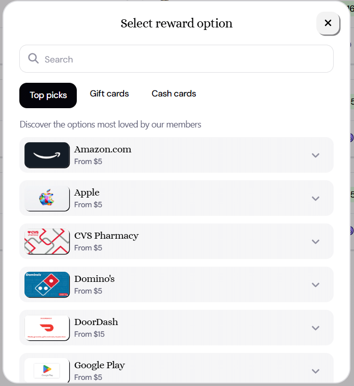 Sproutful gives you a few different ways to cash out. You can redeem prepaid Visa cards if you prefer cash. There's also dozens of gift cards to companies like Amazon, Domino's, Target, Walmart, Sephora, and more.