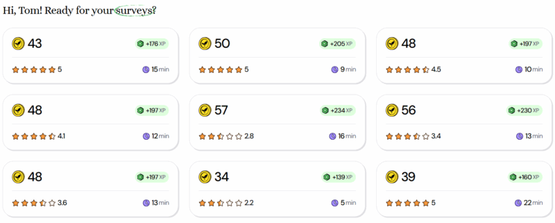 Surveys have a time estimate, which I love. There's also a star-rating system where users rate how good or bad a particular survey was. Together, this helps you pick surveys that are worth your time while dodging frustrating ones.